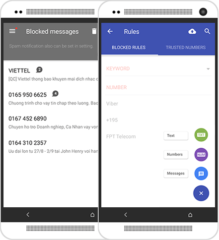 Cho phép tạo luật chặn tin nhắn theo số điện thoại, từ khóa.